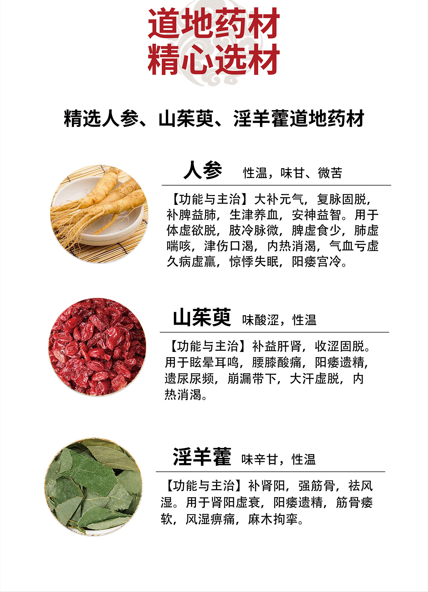 斯力泰牌人参山茱萸淫羊藿胶囊,传承长寿老人李青云千年古方三宝归元方,精选三味道地药材:
