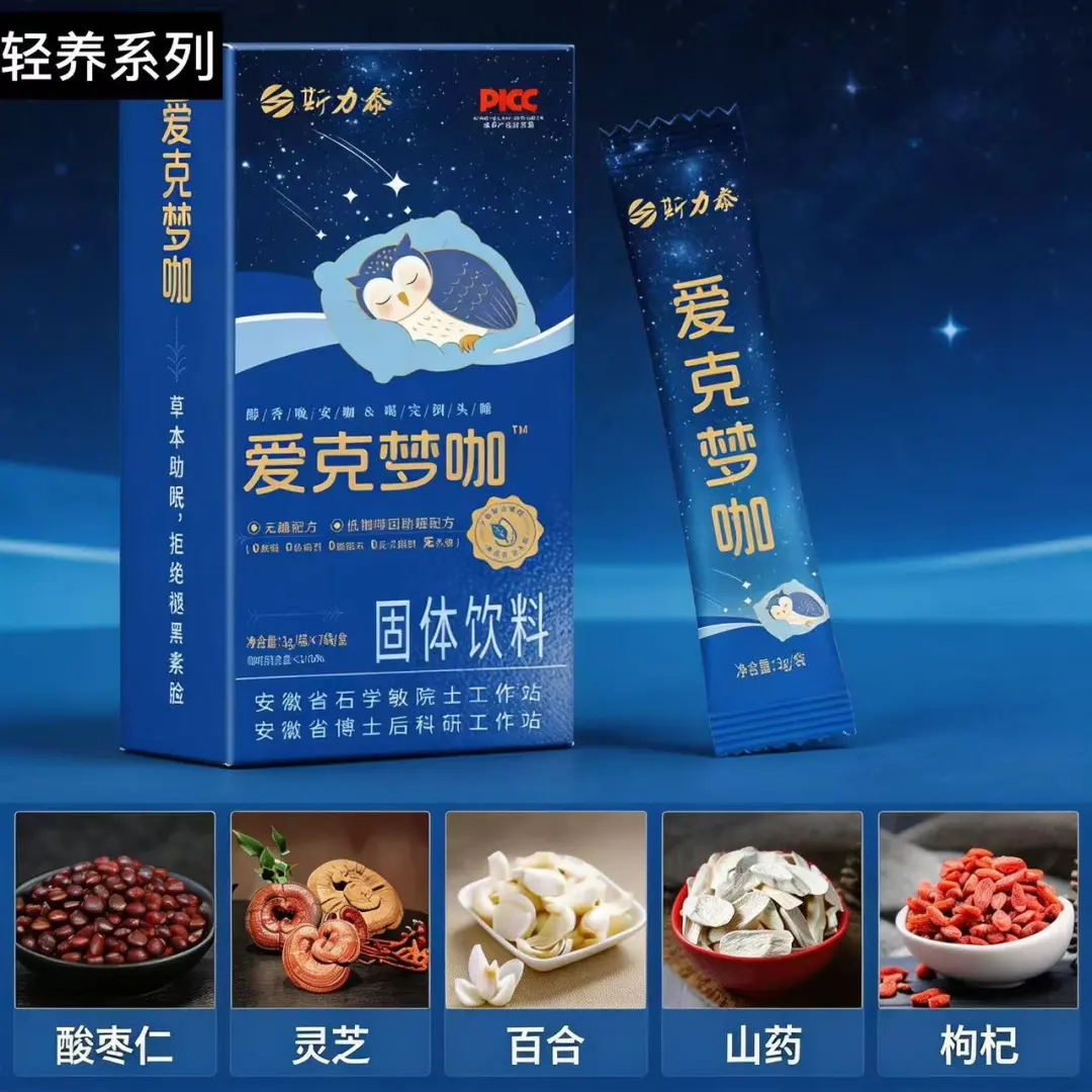 在低因的基础上,产品更以传统草本智慧,为睡眠健康提供了科学支撑。爱克梦咖融合酸枣仁、灵芝、枸杞、百合、山茱萸、山药、红枣等多味药食同源中药材,其中酸枣仁的皂苷成分可调节中枢神经递质、舒缓情绪,灵芝的多糖与三萜类物质能改善睡眠质量,百合、山药等则可滋阴润燥、舒缓身心。这些草本成分与低因咖啡形成协同作用,既保留了咖啡的饮用体验,又通过草本的温和调理,为身体营造出松弛、舒缓的生理状态,实现了 “咖啡风味” 与 “助眠功效” 的双向平衡,让咖啡从 “提神工具” 升级为 “轻养载体”。