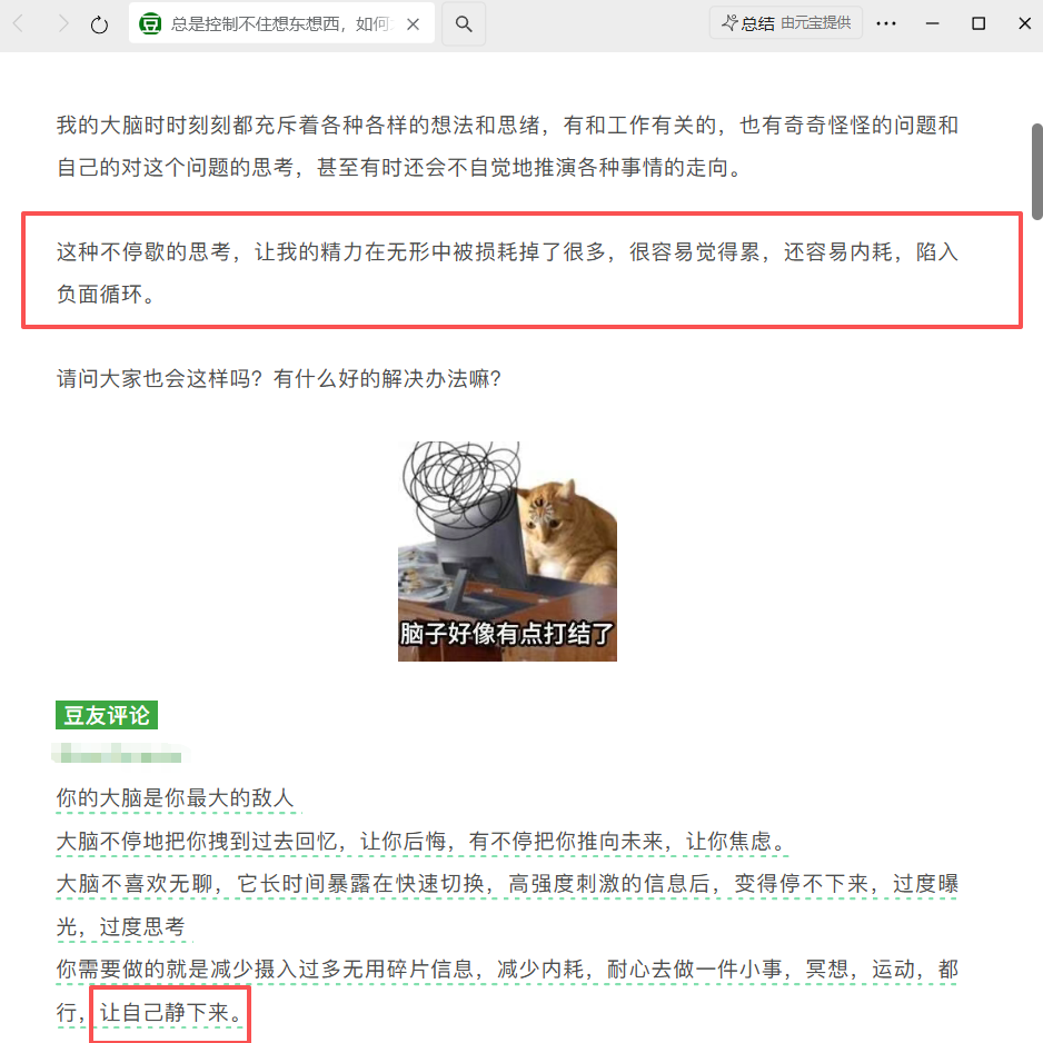 在豆瓣 1.1 万 + 阅读的热帖里,无数人写下了当代人的精神困境:“大脑时时刻刻充斥着各种想法,工作的焦虑、未发生的推演、无意义的内耗,精力被无形损耗,越累越想,越想越累,陷入负面循环”。而评论区高赞的 “让自己静下来”,道尽了千万人对情绪安宁的迫切渴望。